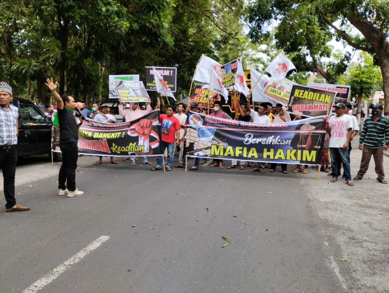 NTB EXPOSE. Lombok Timur – LSM Garuda Indonesia gelar aksi demonstrasi di Pengadilan dan Kejaksaan Negeri Lombok Timur, Rabu (14/9/2022). Massa aksi dari LSM Garuda Indonesia itu mempertanyakan putusan PN Selong dan tuntutan Kejari Lotim atas salah satu perkara pidana kasus penganiayaan.