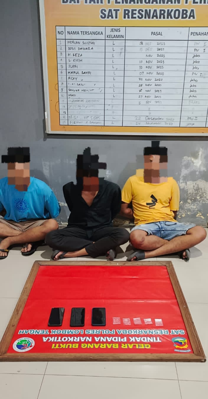 Kapolres Lombok Tengah AKBP Iwan Hidayat, SIK melalui Kasat Narkoba IPTU Derpin Hutabarat, SH, M.Hum mengatakan bahwa, penangkapan terhadap tiga orang terduga pelaku berdasarkan informasi dari masyarakat bahwa di TKP tersebut sering terjadi transaksi narkotika jenis sabu.