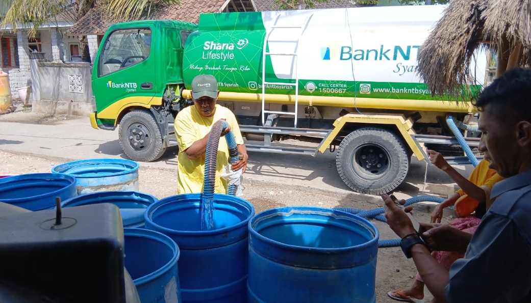 Bantuan ini disalurkan langsung menggunakan mobil tangki air milik Bank NTB Syariah sebagai bagian dari program tanggung jawab sosial kemasyarakatan.
